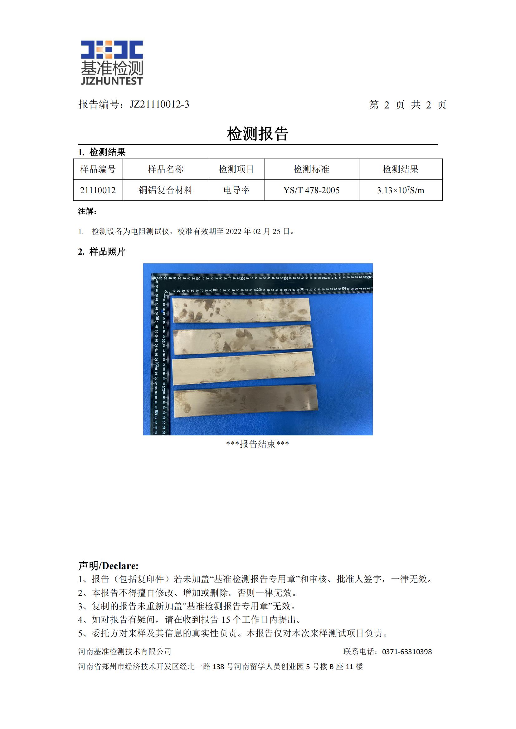 3、根據(jù)測(cè)試結(jié)果,白色面成分符合 GB/T 3190-2020 中對(duì) 1060 的牌號(hào)要求,黃色面成分樣品符合 GB/T 5231-2012 中對(duì) T2 的牌號(hào)要求。